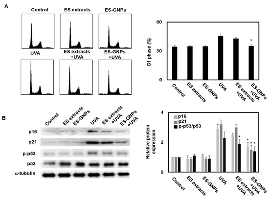 ES-GNPs inhibited the G1 arrest and protein expression of p16, p21 and p-p53 in UVA-irradiated human dermal fibroblasts. (A) The G1 arrest was measured by Flow cytometry using a cell cycle kit. (B) The protein expression of p16, p21, p-p53, p53 and β-tubulin were measured by western blot. Three independent experiments are expressed as mean ± SEM. * p < 0.05 compared to the UVA group. Control: untreated and unirradiated cells. ES extracts: ES extracts treated cells. ES-GNPs: ES-GNPs treated cells. UVA: UVA irradiated cells. ES extracts + UVA: ES extracts treated and then UVA irradiated cells. ES-GNPs + UVA: ES-GNPs treated and then UVA irradiated cells.
