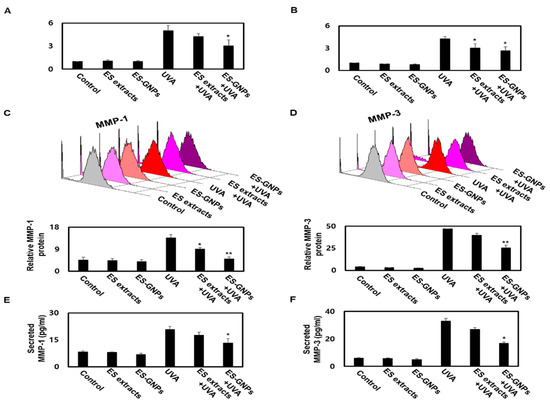ES-GNPs downregulate the transcriptional, translational expression and secretion of MMP-1 and MMP-3 in UVA-irradiated human dermal fibroblasts. Real time PCR was carried out to evaluate the mRNA expression of MMP-1 (A) and MMP-3 (B). Flow cytometry was carried out to evaluate the protein expression of MMP-1 (C) and MMP-3 (D). The content of MMP-1 (E) and MMP-3 (F) in cell culture supernatants was measured using ELISA kit. Three independent experiments are expressed as mean ± SEM. * p < 0.05 and ** p < 0.01 compared to the UVA-irradiated group. Control: untreated and unirradiated cells. ES extracts: ES extracts treated cells. ES-GNPs: ES-GNPs treated cells. UVA: UVA irradiated cells. ES extracts + UVA: ES extracts treated and then UVA irradiated cells. ES-GNPs + UVA: ES-GNPs treated and then UVA irradiated cells.