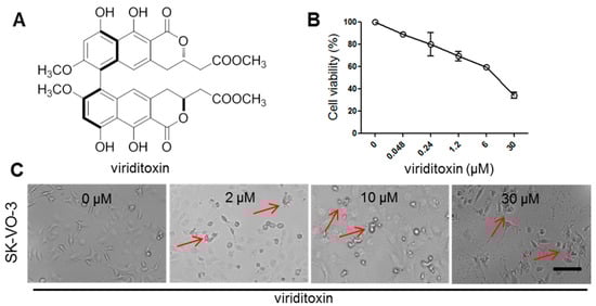 Cytotoxic effects of viriditoxin on SK-OV-3 cancer cells. (A) structure of viriditoxin; (B) SK-OV-3 cancer cells were treated with viriditoxin at various concentrations (0.048201003330.0 μM) for 24 h; (C) morphological changes in SK-OV-3 cancer cells after treatment with viriditoxin for 24 h. Arrows show morphological changes of cells (shrinkage, flattening, rugged periphery of cells). Bar represents a scale of 100 µm.