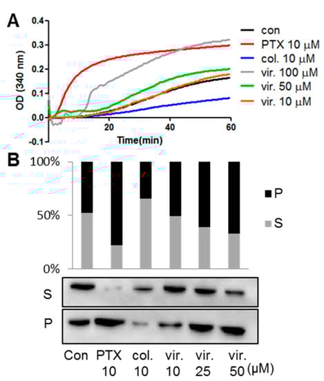 Tubulin polymerization assay. (A) Purified porcine brain tubulin was incubated at 37 °C in the presence of viriditoxin (vir.), paclitaxel (PTX), or colchicine (col.). Tubulin polymerization was measured at 340 nm using a microplate spectrophotometer. Polymerized tubulin absorbs UV light at 340 nm. (B) Alterations in tubulin polymerization induced by paclitaxel, colchicine, and viriditoxin were measured in the SK-OV-3 cells. The distribution of β-tubulin in soluble (S) and particulate (P) fractions in SK-OV-3 cells was detected by Western blotting after 24 h of drug treatment. Polymerized tubulins are insoluble and particulate in the hypotonic buffer. The results were the means of three times of independent experiments.