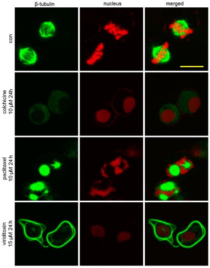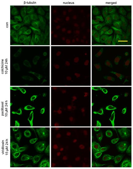 Effect of viriditoxin on the organization of the microtubule cytoskeleton at 24 h. SK-OV-3 cells were treated with viriditoxin 15 µM, paclitaxel 10 µM, or colchicine 10 µM. Bar represents a scale of 50 µm.