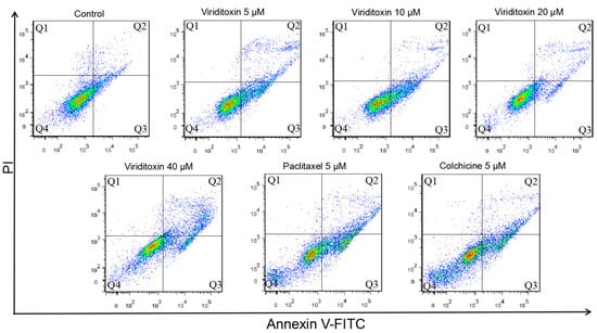 Flow cytometric analysis of apoptosis in SK-OV-3 cells treated with viriditoxin (5–40 μM), paclitaxel (5 μM), or colchicine (5 μM) for 24 h. Cells were stained with annexin V/PI. The Q1 quadrant indicates the population of cells that underwent necrosis, the Q2 quadrant indicates cells in late apoptosis, the Q3 quadrant indicates cells in early apoptosis, and the Q4 quadrant indicates live cells.