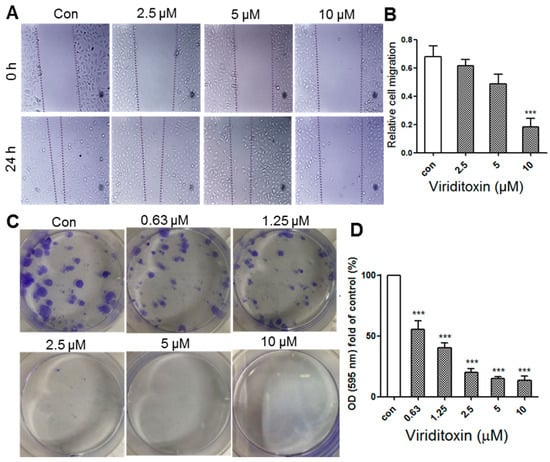 Effect of viriditoxin on cell migration and the colony formation ability of SK-OV-3 cells. (A) the effect of viriditoxin on cell migration as demonstrated by the scratch wound assay for 24 h. Dotted lines represent the cell scraping gap. The distance between the two dotted lines indicates the wound closure distance after cell migration upon viriditoxin treatment at 0 h and 24 h; (B) histogram presentation of the SK-OV-3 cell migration; (C) the effect of viriditoxin on SK-OV-3 cell colony formation. Clonogenicity was evaluated by the monolayer colony formation assay. Representative images show the blue colonies of SK-OV-3 cells stained with crystal violet; (D) histogram presentation of the SK-OV-3 cell colony quantification. *** p < 0.001 vs. the control group.