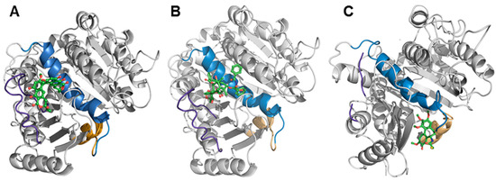 Docking simulation of viriditoxin (A), paclitaxel (B), and colchicine (C) to β-tubulin. The helix 7 (H7) is marked in light blue, the T7 loop is marked in orange, and the M loop (M) is marked in purple. Ligands are shown in green. The binding affinity of colchicine was −7.8 kcal/mol. The affinity scores of paclitaxel and viriditoxin were −8.4 kcal/mol and −8.2 kcal/mol, respectively.