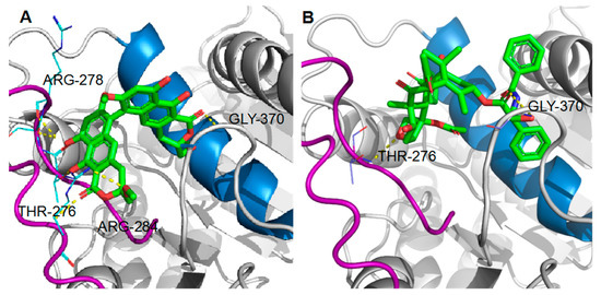 The hypothetical binding mode of viriditoxin was compared with that of paclitaxel (Figure 9). Paclitaxel binds to the pocket of β-tubulin located on the luminal side of the microtubules. This site is composed of the helix H7, strand S7, and the M loop (loops H6-H7, S7-H9) [24]. Viriditoxin was speculated to bind to the paclitaxel-binding site; however, it exhibited hydrogen bonding with Arg278, Arg284, Gly370, and Thr276, whereas paclitaxel displayed hydrogen bonding interactions with Gly370 and Thr276 (Figure 9) [25]. The hydrogen bond (H-bond) with Thr276, which is located on the M loop, was predicted for viriditoxin binding [26]. The M loop is a small loop, and it is crucial for promoting tubulin assembly. During tubulin assembly, the M loop is the junction center of current tubulin binding to another tubulin [23]. When the cell is in the G2/M phase, microtubules are formed by the polymerization of α- and β-tubulins. In this process, the M loop locks the tubulins one by one to transform them into a polymeric microtubule. The reverse process, depolymerization, is dependent on the M loop as well [23,27].