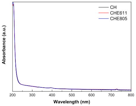 UV–vis light absorption of control (CH) and chitosan films with E805 (CHE805) and E601 (CHE601).