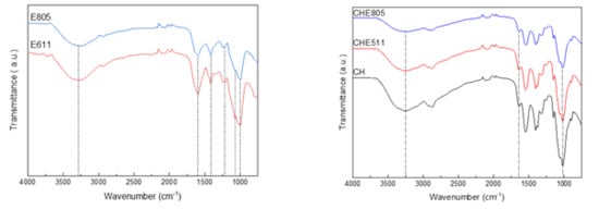 SpainFTIR (Fourier Transform Infrared) analysis was carried out to evaluate the interactions between chitosan and EPS. Regarding EPS (Figure 2a), the main characteristic bands appeared at 3300 cm−1, corresponding to O-H stretching; at 1633 cm−1, associated to C=O stretching; around 1400 cm−1, corresponding to C-H stretching vibrations in hexoses; at 1230 cm−1, associated to the presence of sulfates; at 1100 cm−1, due to glycosidic linkages; and at 1000 cm−1, related to C-O stretching [14]. The most relevant difference between the two EPS was related to the difference in the relative intensity between the bands at 1633 and 1400 cm−1. As can be seen in Figure 2a, the intensity of those bands was similar for E805, indicating a higher content of hexoses, which could lead to a higher TS of CHE805 films due to these cyclic structures providing rigidity. Additionally, a higher EAB of CHE805 films could be due to the promotion of hydrogen bonding with the hydroxyl groups of the hexoses.