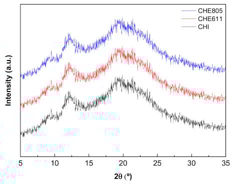 XRD (X-ray diffraction) patterns of control (CH) and chitosan films with E611 (CHE611) and E805 (CHE805).