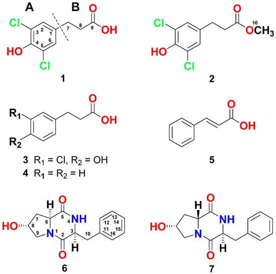 As a part of our endeavor to purify and characterize bioactive marine microbial candidates [,], the antimicrobial fractions of extract of the culture of Streptomyces coelicolor LY001 was investigated. Three chlorinated derivatives of 3-phenylpropanoic acid, including 3-(3,5-dichloro-4-hydroxyphenyl)propanoic acid (1), 3-(3,5-dichloro-4-hydroxyphenyl)propanoic acid methyl ester (2), and 3-(3-chloro-4-hydroxyphenyl)propanoic acid (3), along with 3-phenylpropanoic acid (4) [], E-cinnamic acid (5) and the diketopiperazine alkaloids cyclo(l-Phe-trans-4-OH-l-Pro) (6) [,], and cyclo(l-Phe-cis-4-OH-d-Pro) (7) [,] were isolated and identified. Compounds 1–7 were determined by assignments of their NMR and HRESIMS data. Herein, the isolation, structure assignments, and the antimicrobial activities of 1–7 are presented.