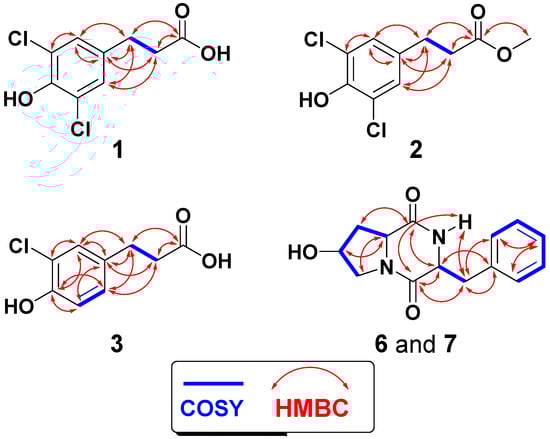 The structure determination of compound 3 (Figure 2) was assigned by examination of its NMR spectroscopic data (Figures S13–S17). Compound 3 with molecular formula of C9H9ClO3 (201.0321, C9H10ClO3, [M + H]+) (Figure S18), being 34 units less than 1, suggests the presence of only one chlorine atom in 3. Its 13C NMR spectrum and HSQC exhibited nine signals for three aromatic methines (C-2, C-5, and C-6), two methylenes (C-7 and C-8), and four quaternary carbons (Table 1). Its 1H NMR spectrum showed two spin-spin coupling systems. The first one includes the aromatic ABX coupling system at δH 7.17 (H-2, d, J = 2.5 Hz), 6.93 (H-5, d, J = 8.5 Hz), and 7.02 (H-6, dd, J = 8.5, 2.5 Hz) (Table 1). These protons are correlated in the HSQC experiment to the signals at δC 128.6 (C-2), 116.1 (C-5), and 128.4 (C-6), respectively. This system supported the existence of a 1,3,4-trisubstituted aromatic moiety in 3. The second spin coupling system includes the vicinal coupling between the methylenes at δH 2.86 (H2-7, t, J = 7.6 Hz) and 2.65 (H2-8, t, J = 7.6 Hz). In the HMBC, H2-7 (δH 2.86) and H2-8 ((δH 2.65) displayed correlation to the signal at δC 173.9 (C-9) (Figure 3), supporting the existence of a 3-substituted propanoic acid moiety as in 1. Again, the placement of the side chain (3-substituted propanoic acid) at C-1 was secured from HMBC of H-2/C-7, H-6/C-7, H2-7/C-1, and H2-8/C-1 (Figure 3). Finally, HMBC of H-2/C-3 (qC, δC 120.8), H-2/C-4 (qC, δC 151.7), H-5/C-4, H-5/C-3, H-5/C-1 (qC, δC 133.5), H2-7/C-9 (qC, δC 173.9), and H2-8/C-9 (Figure 3) supported the substitution on the benzene ring in 3. Again, the chemical shifts of the 1H (H-2, H-5 and H-6) and 13C (C-1–C-6) NMR signals of the 3,5-dichloro-4-hydroxy phenyl moiety in compound 3 are similar with reported data for (S)-3-(3-chloro-4-hydroxyphenyl)-2-(dimethylamino)propanoic acid []. Thus, 3 was assigned as 3-(3-chloro-4-hydroxyphenyl)propanoic acid and this is the first report about its natural occurrence.