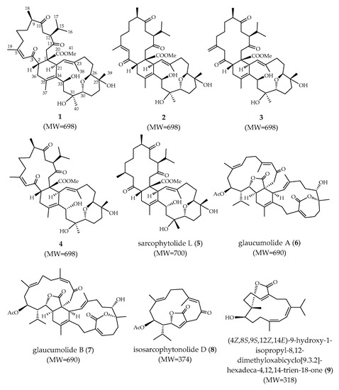 - Chao, C.H.; Li, W.L.; Huang, C.Y.; Ahmed, A.F.; Dai, C.F.; Wu, Y.C.; Lu, M.C.; Liaw, C.C.; Sheu, J.H. Isoprenoids from the soft coral Sarcophyton glaucum. Mar. Drugs 2017, 15, 202. [Google Scholar] [CrossRef]