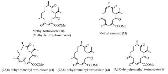 Methyl tortuosoate, also called methyl tetrahydrosarcoate (10) (Figure 4), has been frequently discovered to be the dienophile monomeric cembranoid in the Diels–Alder reaction to biosynthesize relevant biscembranoid, while methyl sarcoate (11) has been found to be the dienophile part of this series biscembranoids for only one time [37]. Biscembranoids 1 and 4 are the Diels–Alder reaction products using (7Z,8)-dehydromethyl tortuosoate (12), 2 using (7E,8)-dehydromethyl tortuosoate (13), and 3 using (7,19)-dehydromethyl tortuosoate (14), respectively, as the dienophiles in the biscembranoids biosynthesis. Cembranoids 12–14 are waiting for discovery in future investigations.