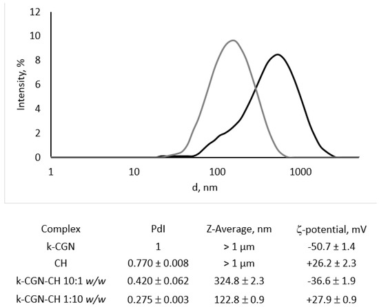 Intensity particle size distribution of κ-CGN-CH 10:1 w/w (black line) and κ-CGN-CH 1:10 w/w (grey line) complexes measured on a Nano ZS (Malvern PANalytical, Malvern, UK) using scattering detection at 173°. The hydrodynamic diameters of the particles were automatically calculated with the instrument’s software based on analysis of the autocorrelation function.