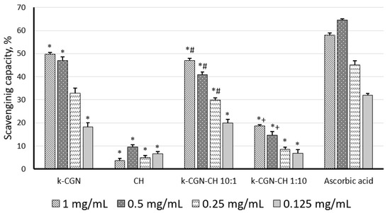 According to Figure 2, κ-CGN showed a pronounced ability to scavenge NO, and its activity (at 1 mg/mL, 0.5 mg/mL) was comparable to the action of the standard (ascorbic acid). CH did not show the ability to scavenge NO (Figure 2). The low activity of this polysaccharide in this test was noted earlier [38]. It was previously reported that with an increase in the MW of chitosan up to 100 kDa, its antioxidant activity have decreased [39]. Together with this, the CH used here had a MW of 110 kDa. The PEC with a high content of κ-CGN exhibited activity comparable to the activity of the initial κ-CGN. Unlike the initial polycation, the complex with a high CH content (κ-CGN-CH 1:10 w/w) exhibited antioxidant activity, although it was less pronounced than κ-CGN and the complex κ-CGN-CH 10:1 w/w.