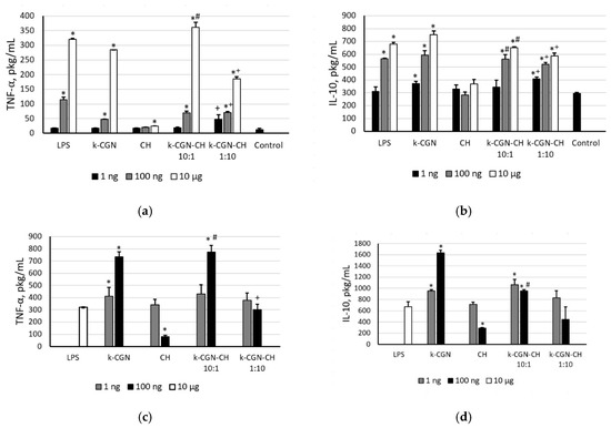 The CGN and PEC did not show an anti-inflammatory activity in the presence of LPS (Figure 3c,d). Only chitosan at a concentration of 100 ng/mL had the ability to suppress of LPS-induced TNF-α and IL-10 production.