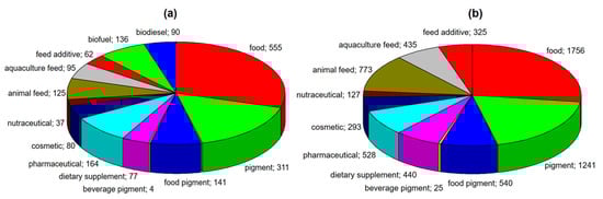 Potential applications of (a) Haematococcus pluvialis and (b) astaxanthin, extracted from this microalga (according to the Web of Science, accessed on 3 August, 2020).