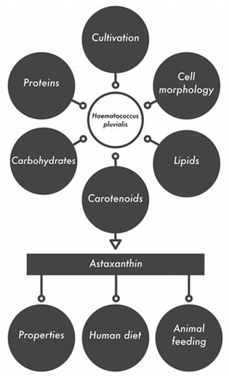 Most applications of both microalga and astaxanthin are related to human nutrition (food, pigments for food and beverages) and health (pharmaceuticals, nutraceuticals and dietary supplements). Much fewer publications are devoted to the use of microalga and extracted astaxanthin in animal nutrition. Therefore, in the presented review, we focused on the biological properties of astaxanthin (antioxidant, anti-inflammatory and anti–diabetic, anticancer) and its application in the nutrition and treatment of humans and animals. These descriptions were preceded by information on the cultivation of Haematococcus pluvialis, its biochemical composition and isolation of astaxanthin, also by means of the innovative extraction techniques. This review presents a comprehensive approach to astaxanthin. The general outline of this review is presented in Figure 2.