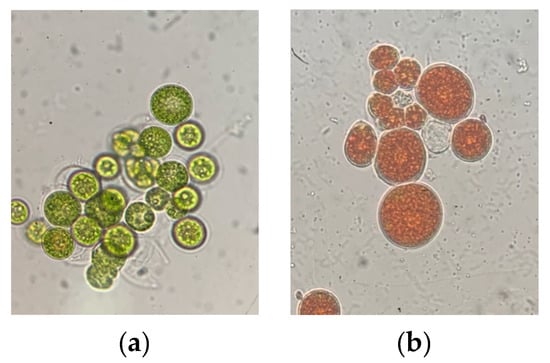 Haematoccocus pluvialis is a unicellular, spherical, green biflagellate oleaginous cell with a diameter of ~30 μm [15,16]. Based on their life cycle, morphology and physiology, H. pluvialis can either exist as vegetative green cells (Figure 3a)—capable of swimming due to their two flagellas, closely connected with green stage and biomass accumulation—or as red cysts (Figure 3b), which accumulate astaxanthin in response to stressful environmental conditions. The cells observed during the vegetative phase are: macrozooids (zoospores), microzooids and palmella, while the cells of the astaxanthin accumulation phase are asexual aplanospores [17].