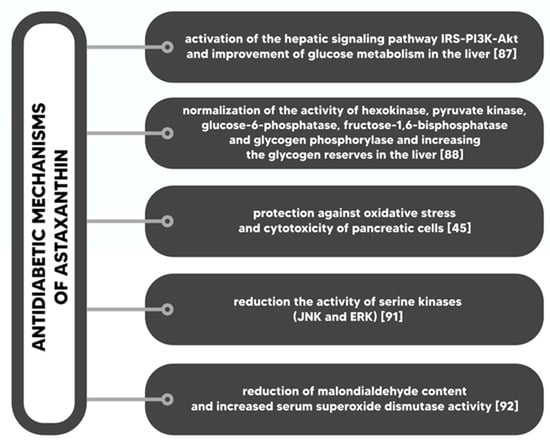 Insulin resistance is a serious disorder of glucose homeostasis, which is characterized by decreased insulin sensitivity of various tissues, such as skeletal muscle, adipose tissue or liver. Insulin resistance is one of the causes of type 2 diabetes and gestational diabetes; usually, it is also a factor in the course of type 1 diabetes. Insulin resistance is often accompanied by hyperinsulinaemia [86]. Astaxanthin improves the whole body’s insulin sensitivity and insulin stimulated glucose uptake in the muscle of insulin-resistant animals. Astaxanthin reduces the level of oxidative stress caused by hyperglycemia in pancreatic β cells and has a positive effect on serum glucose and insulin [87]. Studies in astaxanthin-fed mice have reported increased insulin sensitivity in both hypertensive rats and mice fed with high fat and high fructose diets, while the level of albumin in the urine of diabetic mice was significantly lower than in the control group (without astaxanthin in diet) [87,88]. Bhuvaneswari et al. (2012) confirmed that astaxanthin stimulates the signaling pathway of the insulin receptor substrate (IRS) -PI3K-AKT, due to the reduction of the serine phosphorylation of IRS proteins, and increases glucose metabolism by regulating metabolic enzymes [89]. Astaxanthin is also responsible for lowering the level of cholesterol in blood as well as the level of triglycerol in the liver and stimulating the expression of antioxidant genes. In addition, astaxanthin reduces the expression of CYP2E1 and, as a result, increases the sensitivity of cells to insulin and inhibits liver damage [90]. In the early stages of diabetes, astaxanthin protects pancreatic β cells, increases insulin sensitivity and improves glucose metabolism. As a consequence, insulin resistance and blood glucose levels decrease. Supplementation with astaxanthin reduces oxidative stress, inflammation and lipid peroxidation, therefore it prevents such complications of diabetes as: retinopathy, neuropathy, nephropathy and cardiovascular complications [91]. Mechanisms underlying antidiabetic effects of astaxanthin (Figure 4) are as follows: (I) activation of IRS-PI3K-Akt signals and increased glucose metabolism in the liver; (II) normalization of hexokinase activity, pyruvate kinase, glucose-6-phosphatase, fructose-1,6-bisphosphatase and glycogen phosphorylase; (III) protection against oxidative stress and cytotoxicity in pancreatic cells; (IV) reduction of serine kinases activity; and (V) reduction of MDA [47,89,92,93,94].