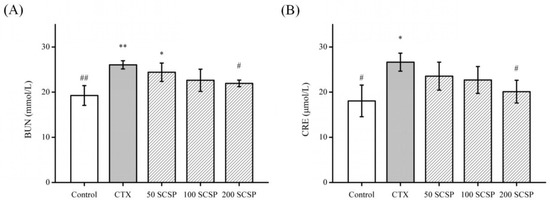 Urea (BUN) and creatinine (CRE) are two indicators that are often used to assess kidney injury; hence, determination of BUN and CRE levels can reflect the degree of kidney injury [5,18]. The serum levels of BUN and CRE were determined to assess the ameliorating effect of SCSP against CTX-induced nephrotoxicity (Figure 1). Compared to the control group, the BUN and CRE levels of the model group increased (p < 0.05), whereas high-dose SCSP-treated groups (200 mg/kg SCSP) were decreased significantly (p < 0.05). Our findings suggested that different doses of SCSP were responsible for kidney recovery to varying extents.