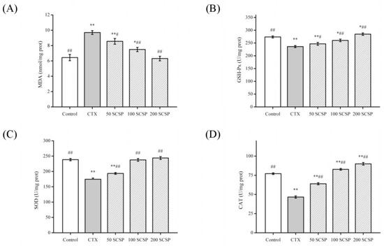 Studies have shown that CTX can change the contents of MDA (lipid peroxidation markers), catalase (CAT), superoxide dismutase (SOD), glutathione peroxidase (GSH-Px) in tissues [19]. To investigate the effect of SCSP on CTX-induced kidney injury, the levels of antioxidant enzymes and MDA were determined. MDA (Figure 2A) levels were significantly higher in the kidneys of CTX-treated mice, while GSH-Px (Figure 2B), SOD (Figure 2C), and CAT (Figure 2D) activities were significantly lower (p < 0.01). In addition, after SCSP treatment, GSH-Px, SOD, and CAT contents showed an upward trend (p < 0.05). These results showed that SCSP significantly reduced CTX-induced kidney injury to a certain extent and exerted a repair effect on the kidney.