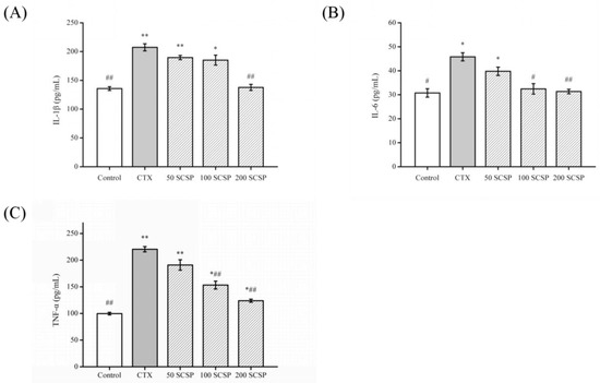 The experimental results are shown in Figure 3. The contents of IL-1β, IL-6, and TNF-α in the kidneys of mice receiving CTX treatment were significantly higher than those in the control group (p < 0.05). In contrast, IL-1β, IL-6, and TNF-α levels in the kidney homogenates of mice treated with SCSP (200 mg/kg) decreased markedly compared to the CTX group (p < 0.01), which was superior to those in the other treatment groups. Therefore, high doses of SCSP may inhibit secretion of these cytokines and may alleviate CTX-induced renal damage.