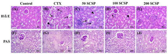 According to the H&E and PAS staining results, CTX caused kidney tissue damage, including necrosis and shedding of kidney tubular epithelial cells, glomerular atrophy, and inflammatory cell invasion in the renal cortex and medulla. After SCSP (200 mg/kg) treatment, renal tubule degeneration decreased and the renal corpuscles tended to be normal, indicating that SCSP was effective in reducing CTX-induced nephrotoxicity.