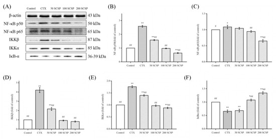 Effect of SCSP (Cyclina sinensis) on cyclophosphamide (CTX)-induced kidney inflammation in mice: (A) western blot of NF-κB-mediated signaling in the kidney; (B) expression of NF-κB p50; (C) expression of NF-κB p65; (D) expression of IKKβ; (E) expression of IKKα; and (F) expression of IκBα. Statistical significance was analyzed by ANOVA. * p < 0.05 and ** p < 0.01 (vs. control group); # p < 0.05 and ## p < 0.01 (vs. model group).