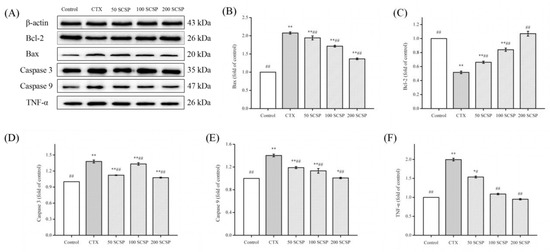Effect of SCSP (Cyclina sinensis) on cyclophosphamide (CTX)-induced kidney apoptosis in mice: (A) western blot of signal transduction mediated by the apoptosis pathway in the kidney; (B) quantification of Bax expression; (C) quantification of Bcl-2 expression; (D) quantification of caspase 3 expression; (E) quantification of caspase 9 expression; and (F) quantification of TNF-α expression. Statistical significance was analyzed by ANOVA. * p < 0.05 and ** p < 0.01 (vs. control group); # p < 0.05 and ## p < 0.01 (vs. model group).