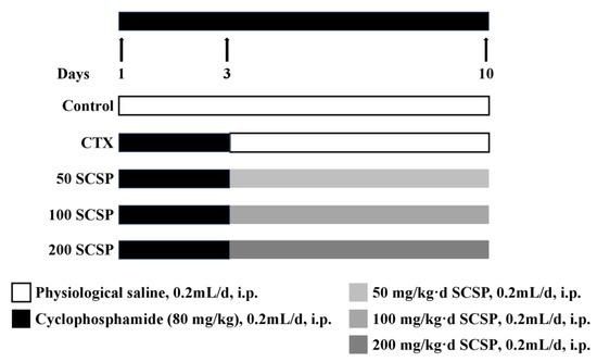 Male ICR mice (20 ± 2 g, 6 weeks old) were purchased from Zhejiang Academy of Medical Sciences (Hangzhou, China). Experimental procedures were approved by the Animal Ethics Committee of the Committee for Research Ethics and Integrity of Zhejiang Ocean University (Zhoushan, Zhejiang, China, No. SCXK ZHE 2019-0031). All mice were housed in a breeding environment with a standard 12 h daylight/darkness cycle at standard humidity (60 ± 5%) and room temperature (23 ± 2 °C). We fed a commercial pellet diet with free access to sterilized water under a pathogen-free environment. After being adapted to feeding for one week, 50 mice were randomly divided into 5 groups: control, model (CTX, 80 mg/kg), 50 SCSP (SCSP, 50 mg/kg), 100 SCSP (SCSP, 100 mg/kg), and 200 SCSP (SCSP, 200 mg/kg) (Figure 7). Except for the control group, all groups were injected with CTX (80 mg/kg b.wt, dissolved in saline, 0.2 mL) for 3 consecutive days. From the fourth day, SCSP was injected intraperitoneally into each drug group (50, 100, and 200 mg/kg b.wt, 0.2 mL) for 7 consecutive days and an equal volume of saline was injected into the model group. Mice in the control group were injected with an equal volume of normal saline once a day for 10 days. Upon completion of the treatment period, the mice were killed by neck dislocation, and intact kidneys were removed and weighed, some of which were used for subsequent biochemical and pathology experiments. The kidney index was calculated as follows: kidney index (mg/g) = kidney weight/body weight.