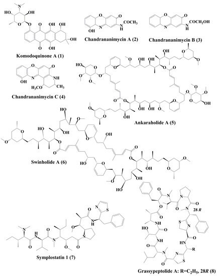 The novel anticancer antibiotics chandrananimycins A (2), B (3), and C (4) with phenoxazin-3-one moiety have been isolated from the marine Actinomadura sp. [85]. These compounds exhibited anticancer activity by inhibiting the proliferation of cancer cell lines such as, CCL HT29 (colon cancer cell), MEXF 514L (melanoma cells), LXFA 526L, LXFL 529L (lung cancer cells), CNCL SF268, LCL H460, MACL MCF-7 (breast cancer cells), and PRCL PC3M, RXF 631L (kidney tumor) [85].