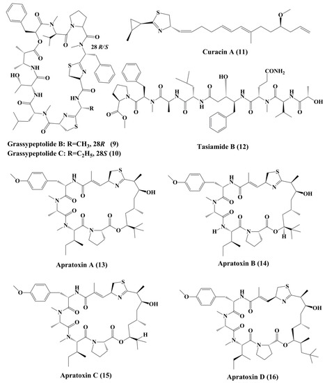 - Matthew, S.; Salvador, L.A.; Schupp, P.J.; Paul, V.J.; Luesch, H. Cytotoxic halogenated macrolides and modified peptides from the apratoxin-producing marine cyanobacterium Lyngbya bouillonii from Guam. J. Nat. Prod. 2010, 73, 1544–1552. [Google Scholar] [CrossRef] [PubMed]