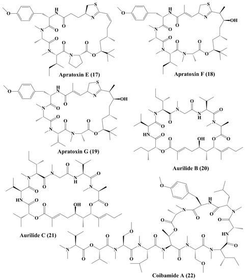 Apratoxin F (18) and G (19) (Figure 3), containing N-methyl alanine in their composition, has been reported to be isolated from Lyngbya bouilloni and have strong cytotoxicity against H-460 lung cancer and HCT-116 colorectal cell lines [100]. Cyclic depsipeptidesaurilide B (20) and C (21) (Figure 3), isolated from Lyngbya majusculus, demonstrated cytotoxicity in human lung tumor cell line NCIH460 and neuro-2a mouse neuroblastoma cells [101]. Aurilides binds prohibitin 1 (PHB1) in the mitochondria, stimulates optic atrophy 1 (OPA1) proteolytic synthesis and contributes to mitochondrial apoptosis [102].Coibamade A (22) (Figure 3) is a cyclic depsipeptide extracted from marine cyanobacterium Leptolyngbya sp. It showed strong cytotoxic activity against a triple-negative breast cancer cell line (MDA-MB-231) [103]. The antiproliferative activity of the active metabolite is associated with the cell cycle arrest at the G1 Phase. Similar observations were reported, where glioblastoma cell lines, such as U87-MG and SF-295, were treated with coibamide A. It also inhibited the proliferation of HUVECs by inducing cell morphology change and reducing the expression level of vascular endothelial growth factor receptor 2 (VEGFR2) [104]. Cobamide A induced autophagy associated cell death of human U87-MG glioblastoma cells and SF-295 glioblastoma cells and mouse embryonic fibroblasts [105].