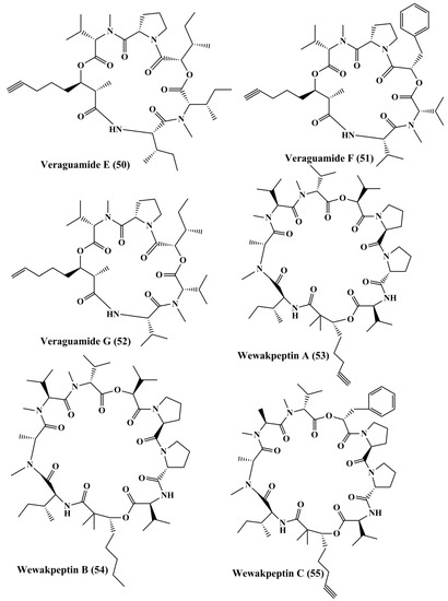 Pitiprolamide (42) (Figure 7) a cyclic depsipeptide obtained from Lyngbya majuscule, showed cytotoxicity against MCF7 breast adenocarcinoma and HCT116 colorectal carcinoma cell lines [119]. Tasipeptins A (43) and B (44) (Figure 7), cyclic depsipeptides derived from Symploca sp., exhibitedcytotoxicity against ĸB oral epidermoid cancer cells [120]. Ulongapeptin (45) (Figure 7), a cyclic depsipeptide obtained from Lyngbya sp., possessed cytotoxicity against ĸB oral epidermoid cancer cells [121]. Veraguamides A–G (46–52) (Figure 7 and Figure 8) are cyclic hexadepsipeptide obtained from Symploca cf. hydnoides [120]. These metabolites demonstrated cytotoxic property against HT29 colon adenocarcinoma and HeLa cervical carcinoma cells [122]. In addition, it also possessed potent cytotoxicity against the H-460 human lung cancer cell line [123]. Wewakpeptins A–D (53–56) (Figure 8 and Figure 9) are depsipeptides obtained from Lyngbya semiplena that have exhibited anticancer activity by inhibiting the proliferation of H-460 lung cancer cells [124].