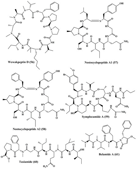 Isolated marine cyanobacteria peptides (56–61).
