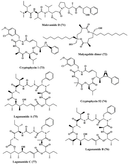 Malevamide D (71) (Figure 11), a peptide ester isolated from Symploca hydnoides, exhibited strong cytotoxicity against a panel of cancer cell line, such as P-388, human lung carcinoma (A-549), and human colon carcinoma (HT-29), and human melanoma (MEL-28) cells [135].Malyngolide dimer (72) (Figure 11) is a cyclodepsipeptide obtained from Lyngbya majuscule exhibited cytotoxicity when evaluated against the H-460 human lung cell line [136].