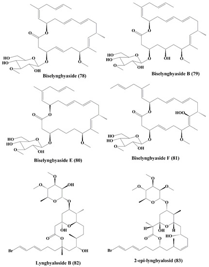Biselyngbyaside (78) (Figure 12), obtained from the Lyngbya sp., is a secreted macrolide glycoside that induced apoptosis by nuclear condensation of mature osteoclasts [144]. Cytotoxicity has been demonstrated against HeLa S3, SNB-78 (central nervous system cancer) and NCI H522 (lung cancer) cells [144]. Biselyngbyasid B (79) (Figure 12), obtained from Lyngbya sp., showed cytotoxicity against HeLa S3 cells and HL60 cells [145]. Biselyngbyaside E (80) and F (81) (Figure 12) showed cytotoxic activity against HeLa and HL60 cells [146]. Lyngbyaloside B (82) (Figure 12), a macrolide glycoside isolated from Lyngbya sp., was shown to have a cytotoxic impact on ĸB cells and had a slightly reduced effect on LoVo cells [147]. Further, 2-epi-lyngbyalosid (83) (Figure 12), a macrolide glycoside extracted from Lyngbya bouillonii, demonstrated cytotoxic properties against HT29 colorectal adenocarcinoma and HeLa cells [148].