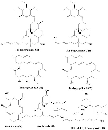 In addition, 18E-lyngbyaloside C (84) and 18Z-lyngbyaloside C (85) (Figure 13) also displayed potent cytotoxic property against HT29 colorectal adenocarcinoma and HeLa cells [148]. Biselyngbyolide A (86) and B (87) (Figure 13) are macrolide metabolites that have been isolated from the marine cyanobacterium Lyngbya sp., and have shown strong cytotoxicity against HeLa S3 cells and HL60 cells [149].Koshikalide (88) (Figure 13), a macrolide isolated from Lyngbya sp., displayed cytotoxic activity against HeLa S3 cells [150]. Acutiphycin (89) and 20,21-didehydroacutiphycin (90) (Figure 13), both macrolides isolated from Oscillatoria acutissima, demonstrated cytotoxic activity against ĸB cells and NIH/3T3 cells [151]. Lyngbouilloside (91) (Figure 14), a macrolide glycoside isolated from cyanobacteria Lyngbya bouillonii showed cytotoxic effect against neuroblastoma cells [152]. Polycavernoside D (92) (Figure 14), another glycosidic macrolide isolated from cyanobacteria Okeania sp., exhibited cytotoxic effect against human lung cancer cells (H-460) [153].