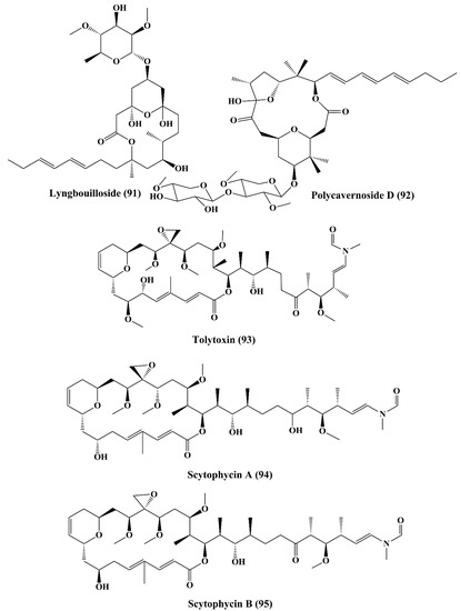 Tolytoxin (6-hydroxy-7-O-methyl-scytophycin B, 93) (Figure 14), a macrolide isolated from the lyophilized cells of Seytonema ocellaturn, exhibited cell growth inhibition of a panel of mammalian cells [154]. Scytophycin A–E (94–98) (Figure 14 and Figure 15), were reported to be isolated from blue green alga Seytonema pseudohofmanni, exhibited cytotoxic effect against human carcinoma of nasopharynx cell (ĸB cells) [155]. Caylobolide A (99) (Figure 15) is a macrolactone obtained from cyanobacteria Lyngbya majuscula that has exhibited In vitro cytotoxicity against human colon tumor cells HCT 116 [156]. Caylobolide B (100) (Figure 15) is obtained from Phormidium sp., and this has exhibited cytotoxic activity against HT29 colorectal adenocarcinoma and HeLa cervical carcinoma cells [157].