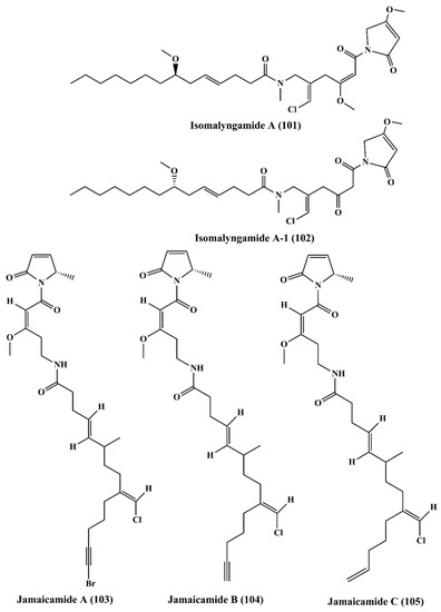Isomalyngamide A (101) (Figure 16) belongs to the class of fatty acid amines, which is isolated from the cyanobacteria Lyngbya majuscule and has inhibited the proliferation ofbreast cancer MCF-7 and MDA-MB-231 cells [158]. Isomalyngamide A-1 (102) (Figure 16) is extracted from cyanobacteria Lyngbya majuscule and Lyngbya sordida and has been shown to inhibit the proliferation of MDA-MB-231 cells [158]. Jamaicamides A (103), B (104), and C (105) (Figure 16) are fatty acid amines containing compound extracted from Lyngbya majuscule and Lyngbya sordida, showed cytotoxicity to both the H-460 human lung and neuro-2a mouse neuroblastoma cell lines [159].