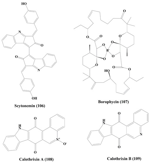 Scytonemin (106) (Figure 17) is a yellow-green pigment obtained from stigonema species of blue-green algae (cyanobacteria). It showed antiproliferative activity against Jurkat T cells by inducing apoptosis. The formation of mitotic spindle and the protein serine/threonine kinase activity was inhibited by scytonemin [160,161].