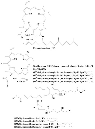 - Huang, X.; Li, M.; Xu, B.; Zhu, X.; Deng, Z.; Lin, W. Proteasome and NF-κB inhibiting phaeophytins from the green alga Cladophora fascicularis. Molecules 2007, 12, 582–592. [Google Scholar] [CrossRef]