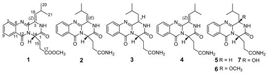 The biosynthetic gene clusters in one fungus species usually destine the generation of structurally versatile secondary metabolites [1]. In recent years, plenty of structurally-unique secondary metabolites have been obtained from the marine-derived fungi [2,3]. However, natural compounds from fungi usually have a high degree of chiral variety, forming one structure with different configurations, which caused a challenging task of determination for their configurations, especially when the molecules displayed high conformational flexibility [3]. Meanwhile, the stereochemistry of molecules has become one of the most important features of chiral natural products, which play a fundamental role in biology, chemistry and medicine. Thus, assigning the stereochemical characterizations attracted more and more attentions in the field of natural medicinal chemistry [4,5]. In our research on structurally-unique and biologically-active metabolites from the marine-derived fungi, the fungal strain Penicillium polonicum HBU-114, whose EtOAc extract exhibited the original thin-layer chromatography (TLC) and high performance liquid chromatography-under voltage (HPLC-UV) profiles of the secondary metabolites, differed from the other fungi, attracted our attention. HPLC-guided separation resulted in the isolation of three new quinazoline alkaloids, polonimides A–C (1–3) and four known analogues, aurantiomide C (4) [6], anacine (5) [6], aurantiomide A (6) (Figure S24) [6] and aurantiomide B (7) (Figure S25) [6] (Figure 1). Herein, we report the isolation, absolute configurations and bioactivity of these compounds.