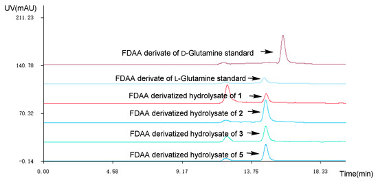 Compounds 1–3 (0.2 mg, respectively), dissolved in 0.5 mL of 6N HCl under the temperature of 110 °C, were hydrolyzed for 4 h. After temperature of the solutions dropped to 25 °C, the mixture were evaporated to dryness under vacuum with addition of distilled H2O to remove the trace HCl, then redissolved it in H2O (50 μL). The divided hydrolysate were treated with 200 μL of 0.5% (w/v) 1-fluoro-2-4-dinitrophenyl-5-L-alanine amide (FDAA) in acetone and 20 μL 1N NaHCO3 in order of precedence. The mixture was stirred at 45 °C for 40 min and then it was quenched through the addition of 20 μL of 2N HCl. The mixture was evaporated to give the resulting residues, which was dissolved in MeOH (20 μL) [17]. Similarly, the standard amino acid L-Glutamine and D-Glutamine were derivatized with FDAA using the same procedure as that of 1–3. And the derivatives were analyzed by HPLC with linear isocratic elution (MeOH-H2O (70:30, v:v)) detected at 254 nm.