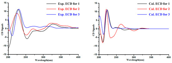 Quantum chemical calculations for 1–3 and 5 were carried out on the basis of previous references (gas phase) [12,13,14]. Chemical structures of 1–3 and 5 were constructed and used for conformational searches using MMFF94S force field by the BARISTA 7.0 software (CONFLEX Corporation Tokyo, Japan). Of all the geometries, those with relative energy of 0–10.0 kcal/mol (93 stable conformers for 1, 85 stable conformers for 2, 49 stable conformers for 3 and 58 stable conformers for 5) were optimized at the B3LYP/6-311+G(d) level, then those with a relative energy of 0–2.5 kcal/mol (15 conformers for 1, 27 conformers for 2, 9 conformers for 3 and 16 conformers for 5) were chosen for ECD calculations at the B3LYP/6-311++G(2d,p) level and simulated using SpecDis 1.71 [15]. In addition, DP4plus applications were used to assign the absolute configurations of 3 and 5, the optimized conformers were calculated at the B3LYP/6-311+G(d,p)//B3LYP/6-311+G(d,p) level for the unshielded tensor values. All of the calculations were processed with Gaussian 09 package [16].