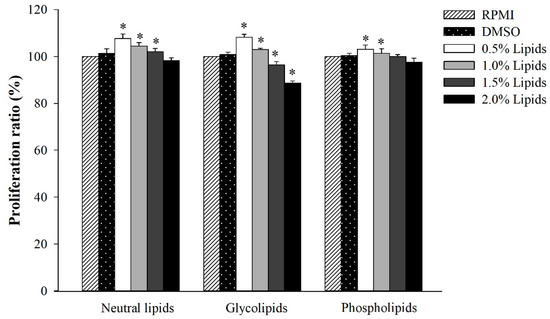 The effect of A. japonicus lipid-fractions (neutral lipids, glycolipids and phospholipids) on cell proliferation in RAW264.7 cells. The data were presented as the mean ± SD of three independent experiments. Significant difference was observed at p < 0.05 (*) when compared with RPMI medium.