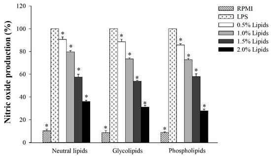 The effect of A. japonicus lipid-fractions (neutral lipids, glycolipids and phospholipids) on the production of nitric oxide (NO) in lipopolysaccharide (LPS)-stimulated RAW264.7 cells. The data were presented as mean ± SD of three independent experiments. A significant difference was observed at p < 0.05 (*) when compared with LPS.