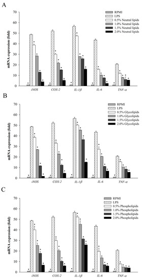 The effect of A. japonicus lipid-fractions (neutral lipids, glycolipids and phospholipids) on immune-associated gene expression in LPS-stimulated RAW264.7 cells. (A) The relative mRNA expression of neutral lipids; (B) The relative mRNA expression of glycolipids; (C) The relative mRNA expression of phospholipids. The data were presented as mean ± SD (n = 3). A significant difference was observed at p < 0.05 when compared with LPS (*).