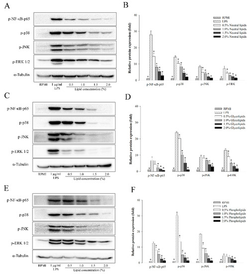 To further investigate whether the lipid fractions of A. japonicus exhibited anti-inflammatory activity in LPS-stimulated RAW264.7 cells, we determined the protein expression levels of LPS-induced phosphorylation of MAPKs and NF-κB-p65 pathways in RAW264.7 cells by performing western blot analysis. Figure 4 shows that neutral lipids (Figure 4A,B), glycolipids (Figure 4C,D), and phospholipids (Figure 4E,F) suppressed the phosphorylation of NF-κB p65 subunit in a dose-dependent manner, when compared to that in the control.