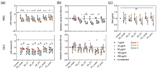 To test the tolerance of OEC and MSC towards different doses of the enzymatically extracted fucoidans, we studied the metabolic activity and membrane integrity of the cells after seven days of treatment with five different fucoidan concentrations ranging from 1 to 200 µg/mL using MTS and LDH assays, respectively. Fucoidan treatment did not increase the release of LDH in both cell types, indicating that none of the extracts is cytotoxic (Figure 1a). The metabolic activity of OEC was not affected by fucoidan treatment, while it was lowered by treatment with the purer FE_F2 and FE_F3 extracts in MSC. A concentration-dependent trend can be observed, as high fucoidan concentrations decrease metabolic activity in MSC more prominently (Figure 1b). To assess whether these findings are related to a decreased MSC proliferation or are only related to metabolic effects, we quantified the DNA content in the respective MSC mono-cultures. The quantification of DNA content in MSC confirms that the cell number is not significantly altered by treatment with any tested fucoidan extract (Figure 1c). These results demonstrate that all tested doses are non-toxic to primary OEC and MSC and ensure that differences in protein production are not reduced to an unequal number of cells.